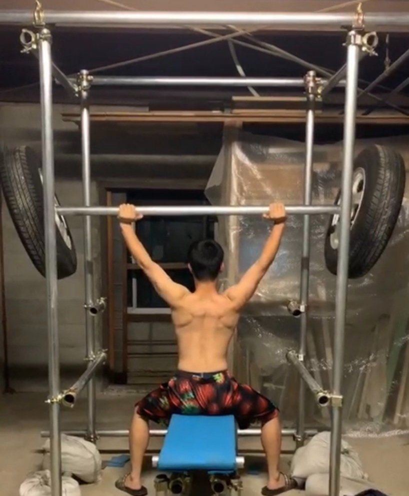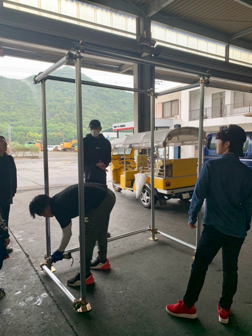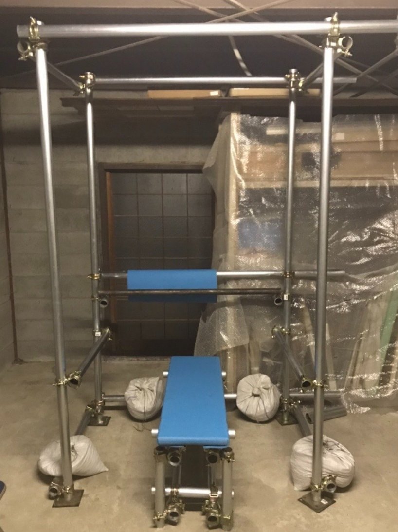 小豆島の山間部、肥土山地区にある選手寮で、0円でトレーンニングルームを作ろうという計画がスタート!早速スポーティーズの代表に相談し、単管をゲット!みんなで組み上げてラックとベンチが完成しました!重たい鉄の棒と廃タイヤを使ってバーベルがわりに。
